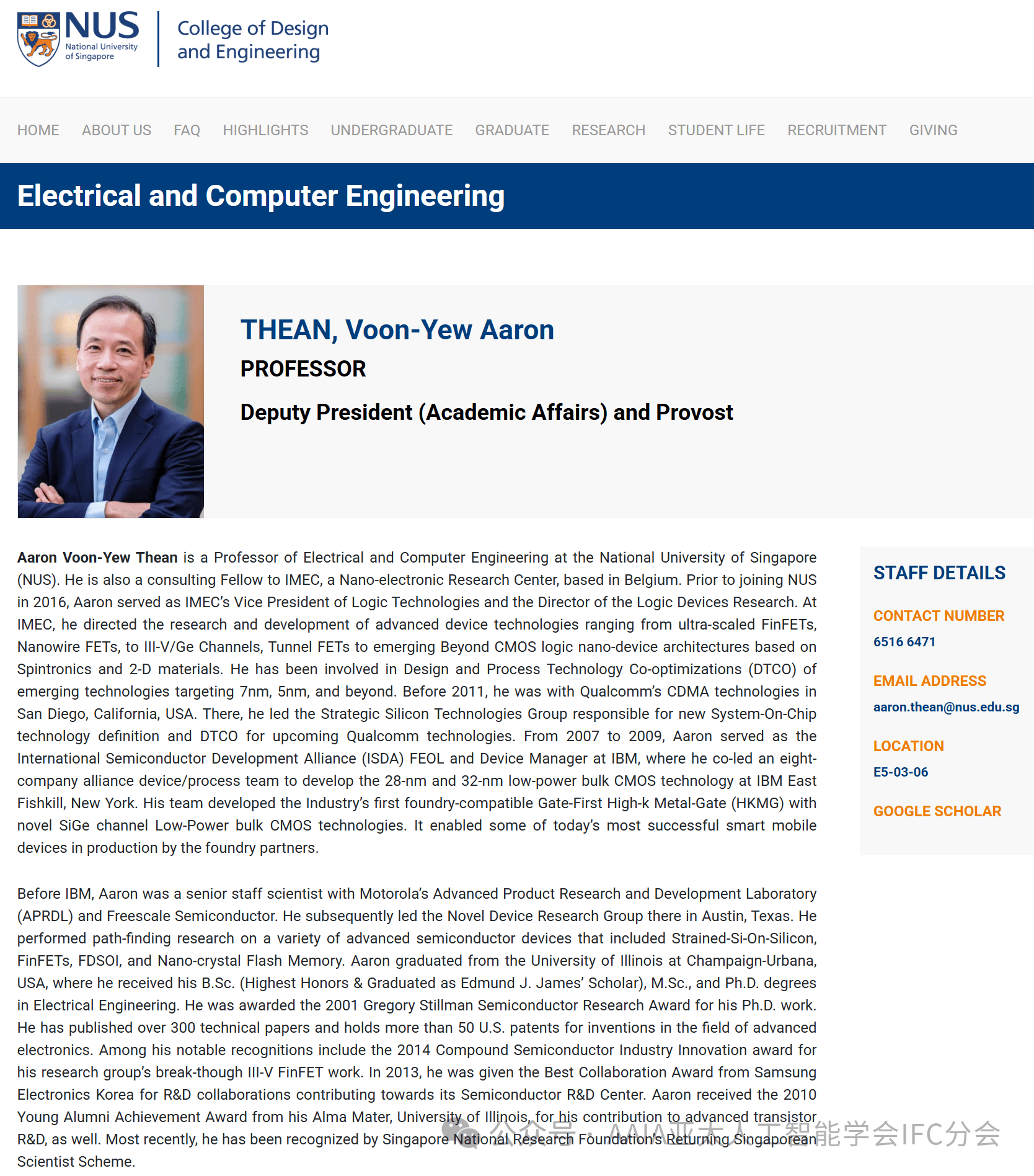 Aaron Thean传授的工做架起了学术界取财产界之间的桥梁,他颁发了300多篇手艺论文,后回到新加坡国立大学处置学术研究和办理工做。正在IMEC,他的团队开辟了业界首个兼容晶圆厂的Gate-First高k金属门(HKMG)。创立NUS-使用材料公司企业结合尝试室,纳米线场效应晶体、III-V/Ge通道、地道场效应晶体到基于自旋电子和二维材料的新兴超越CMOS逻辑纳米器件架构的先辈器件手艺的研发。正在那里,插手国际人工智能科学院(AAIS),Aaron Thean传授展示了杰出的带领才能和立异: